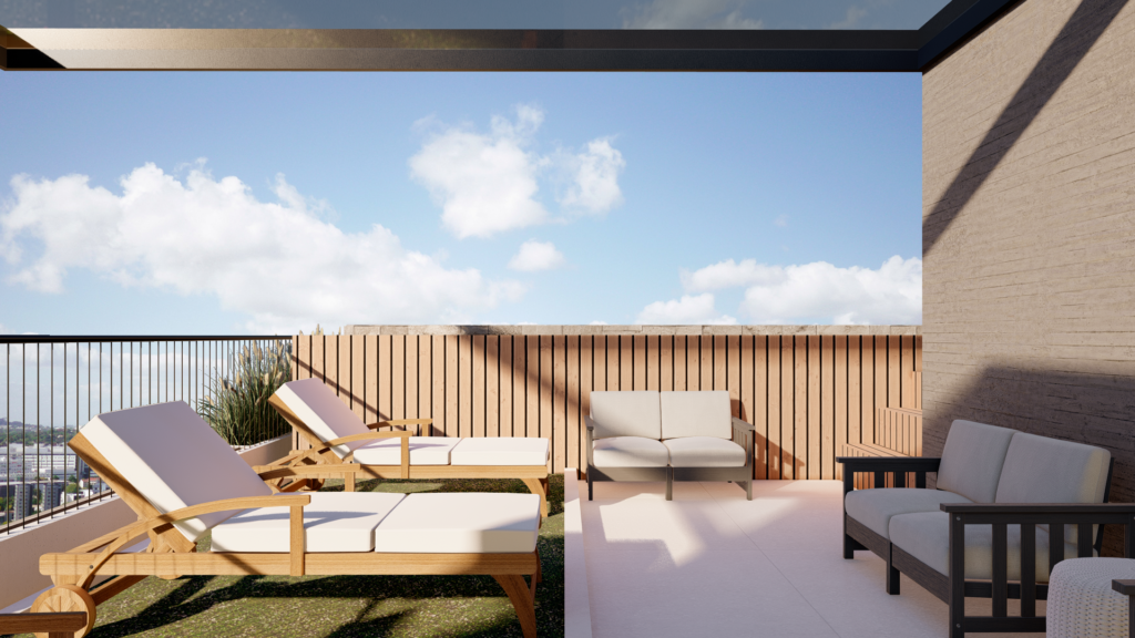 Graças à sua privilegiada localização, todos os apartamentos desfrutam de vistas desobstruídas para o pôr-do-sol em sua área social, sem interferência de edificações presentes ou futuras. Além disso, devido à sua altura, os espaços sociais estabelecem uma conexão direta com a calçada, proporcionando uma sensação de lar em um apartamento.