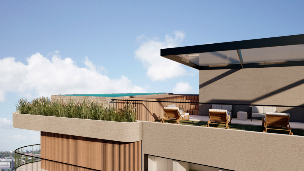 As áreas de lazer para os moradores estão localizadas no térreo e último pavimento – rooftop. O térreo abriga um salão de festas amplo e um espaço aberto para lazer. O rooftop, por sua vez, possui uma piscina e espaço para contemplação da paisagem.